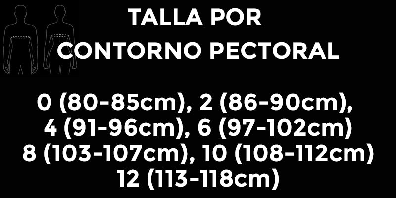 - Producto en varias tallas, medidas según contorno de pecho: 0 (80-85cm), 2 (86-90cm), 4 (91-96cm), 6 (97-102cm), 8 (103-107cm), 10 (108-112cm) y 12 (113-118cm) Se recomienda medir la máxima amplitud pectoral entre la línea mamaria y las axilas. (En caso de duda contactar en info@aonijie.es para recomendar la talla idónea, se debe tener en cuenta el somatotipo al cerrar por completo el torso)