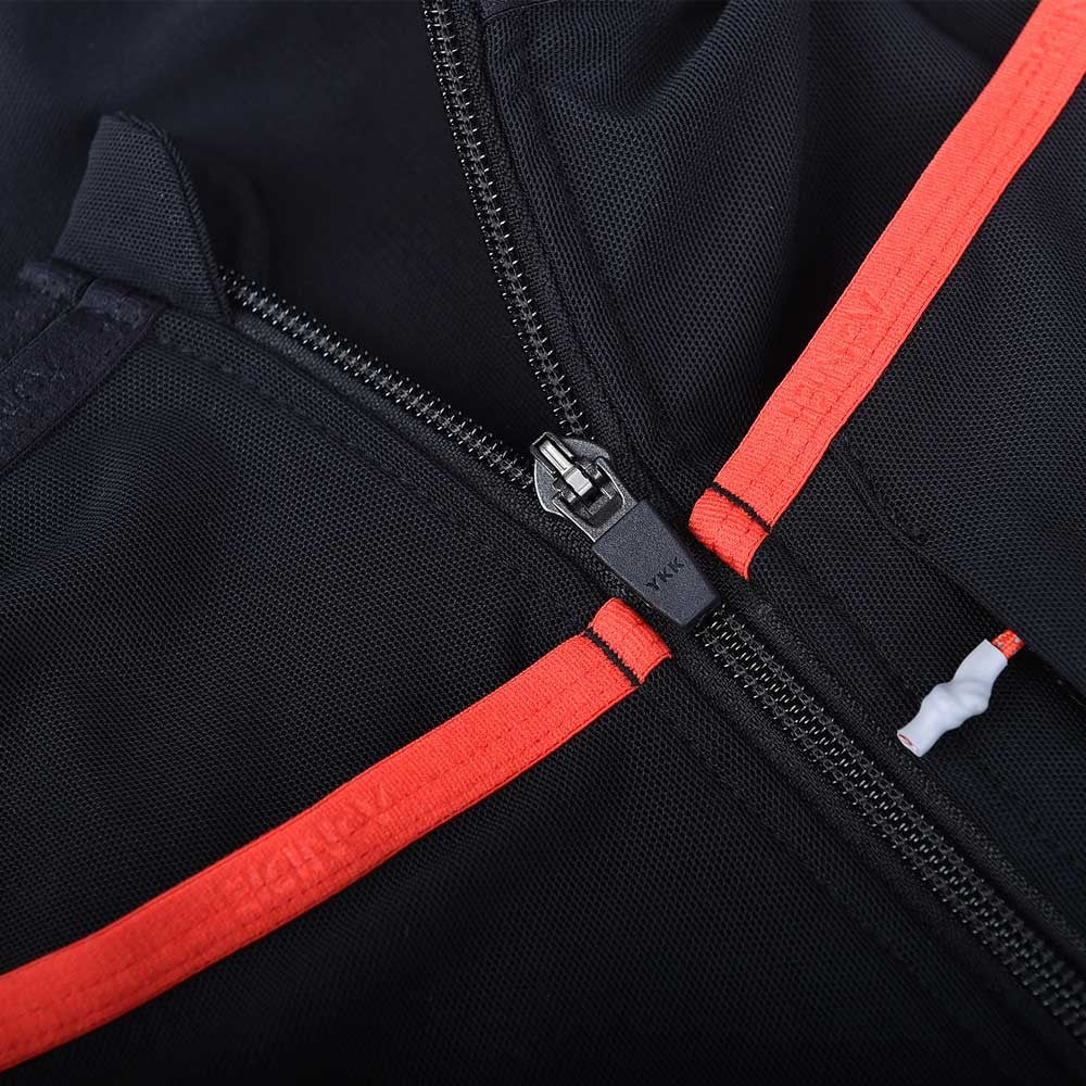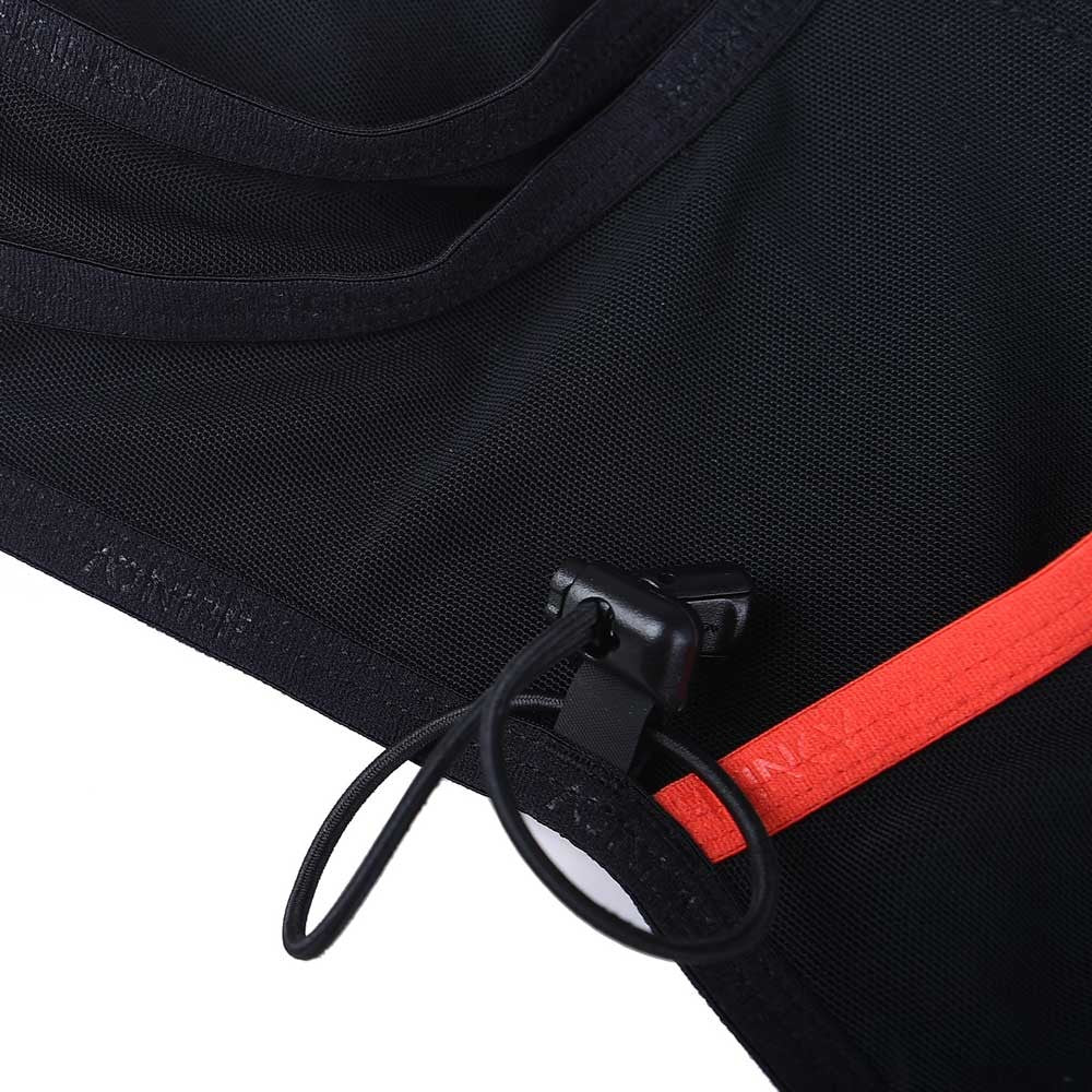 - Dos bolsillos delanteros de malla expandible con capacidad para dos soft flask de 500ml, y goma elastica con tirador reflectante para sujerar el soft flask doblemente, cierre bolsillo elástico y goma elástica