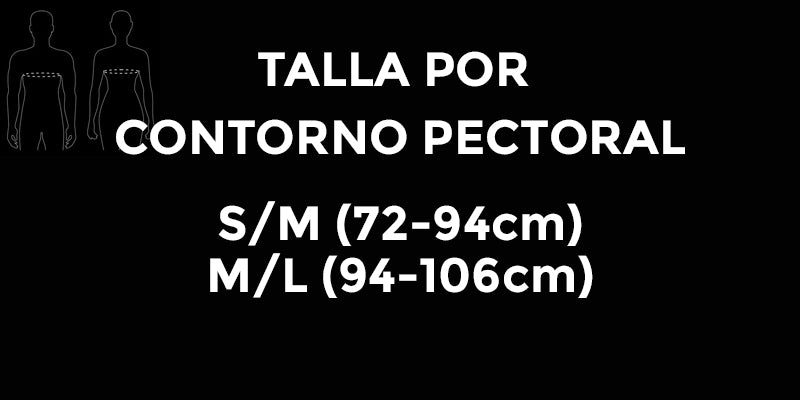 - Disponible en 2 tallas dependiendo el contorno de pecho: S/M (72-94cm), M/L (94-106cm)