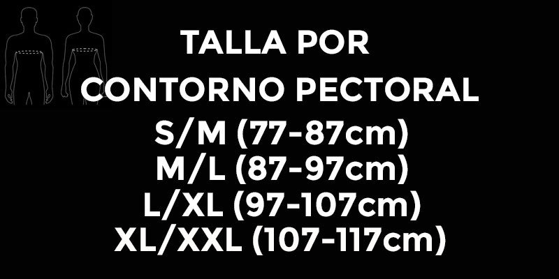 Producto en varias tallas, medidas según contorno de pecho: S/M (77-87cm); M/L (87-97cm) ; L/XL (97-107cm); XL/XXL (107-117cm). Se recomienda medir la máxima amplitud pectoral entre la línea mamaria y las axilas.