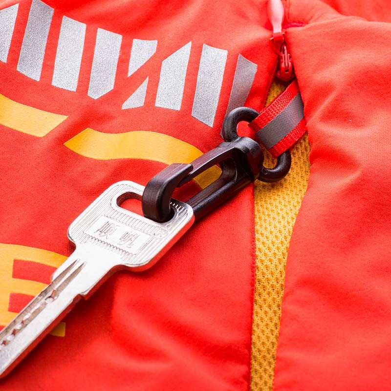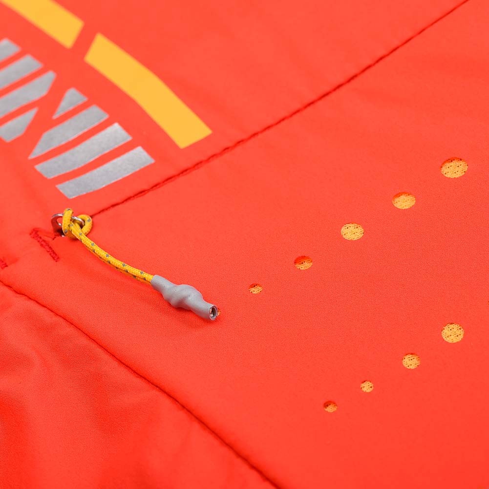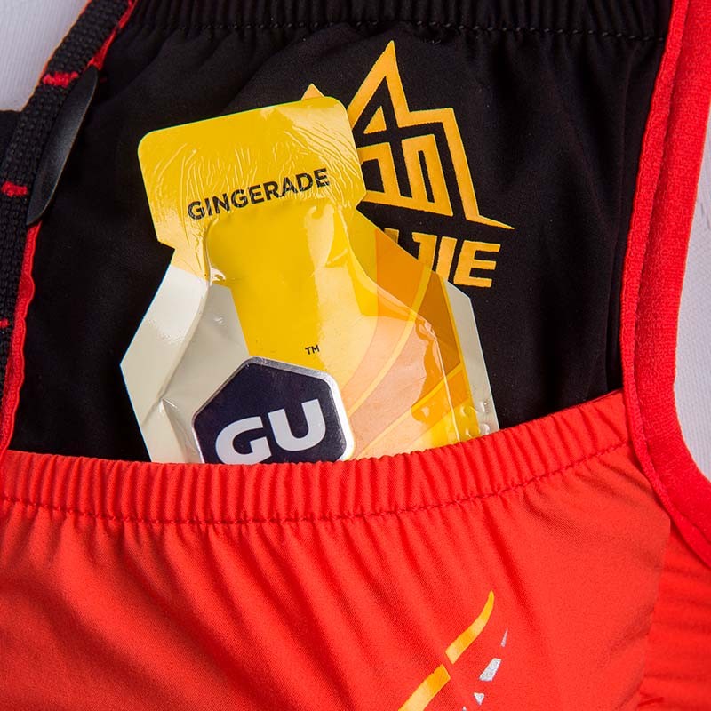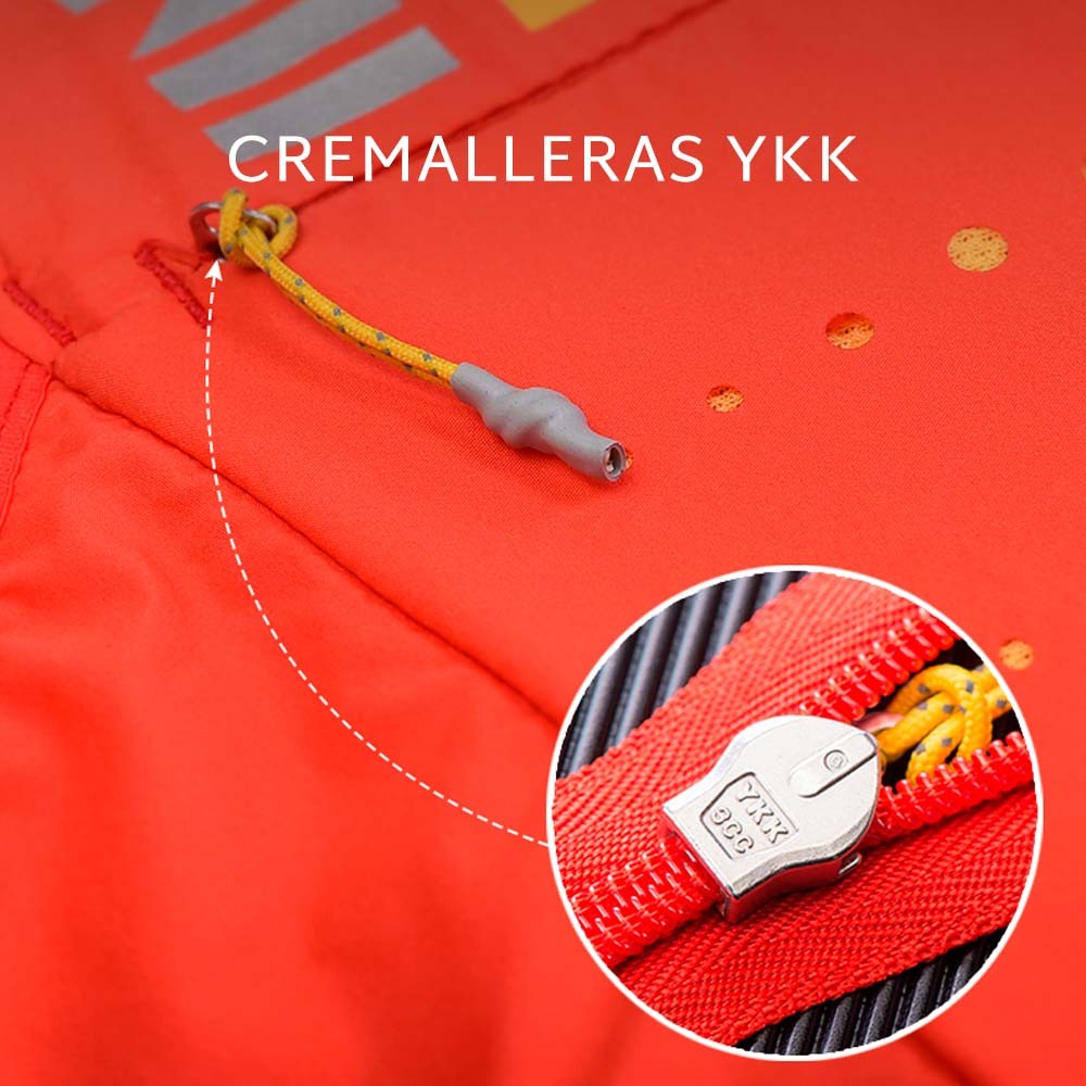 Dos bolsillos delanteros de malla expandible con capacidad para dos soft flask de 500ml, y goma elastica con tirador reflectante para sujerar el soft flask doblemente, cierre bolsillo elástico y goma elástica