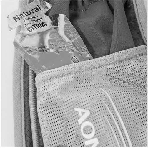 - Un bolsillo delantero de malla expandible con capacidad para un soft flask 500ml (no incluida) con cierre ajustable mediante elástico con bloqueo