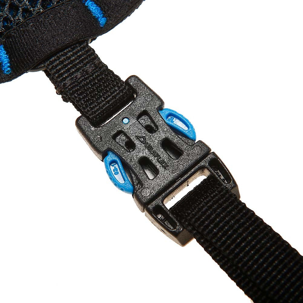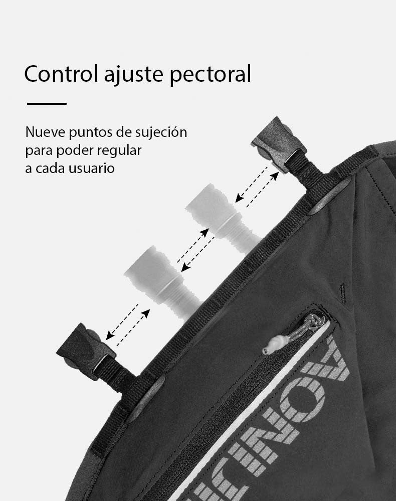 - Sistema de ajuste delantero personal ligero y sencillo que elimina puntos de presión en la zona del esternón y aumenta la comodidad para respirar. Hebillas Duraflex, para una garantia de anclaje. Con posibilidad de ajustar en 9 alturas diferentes, a gusto del usuario/a