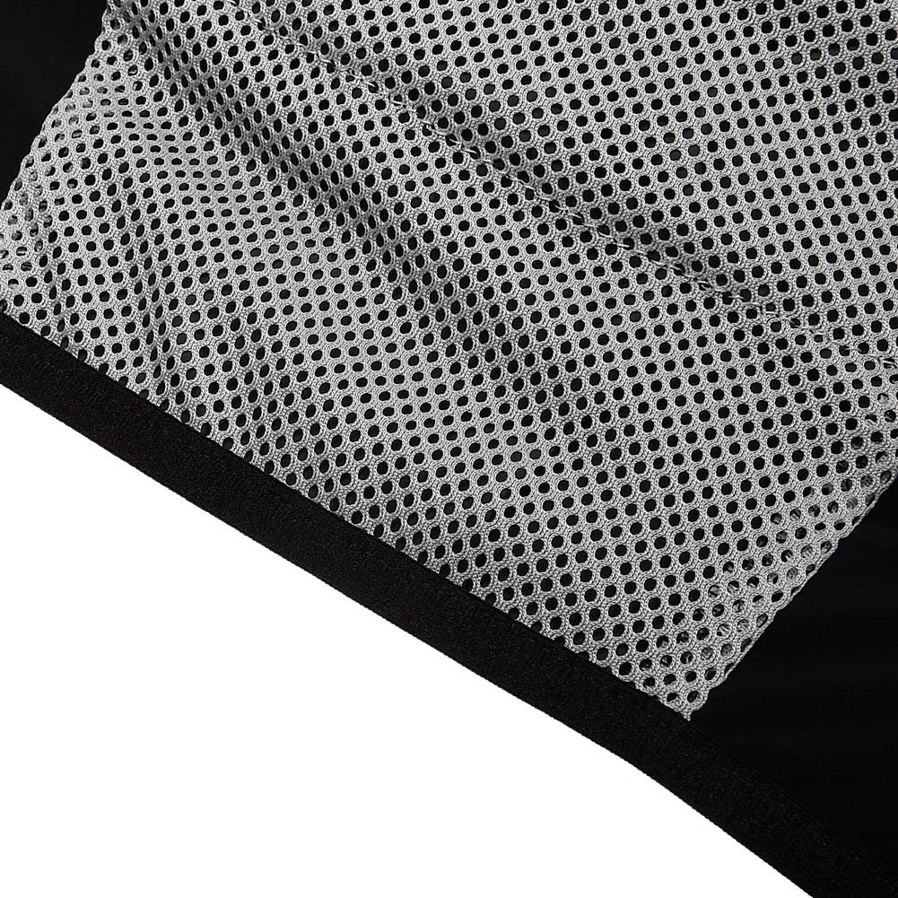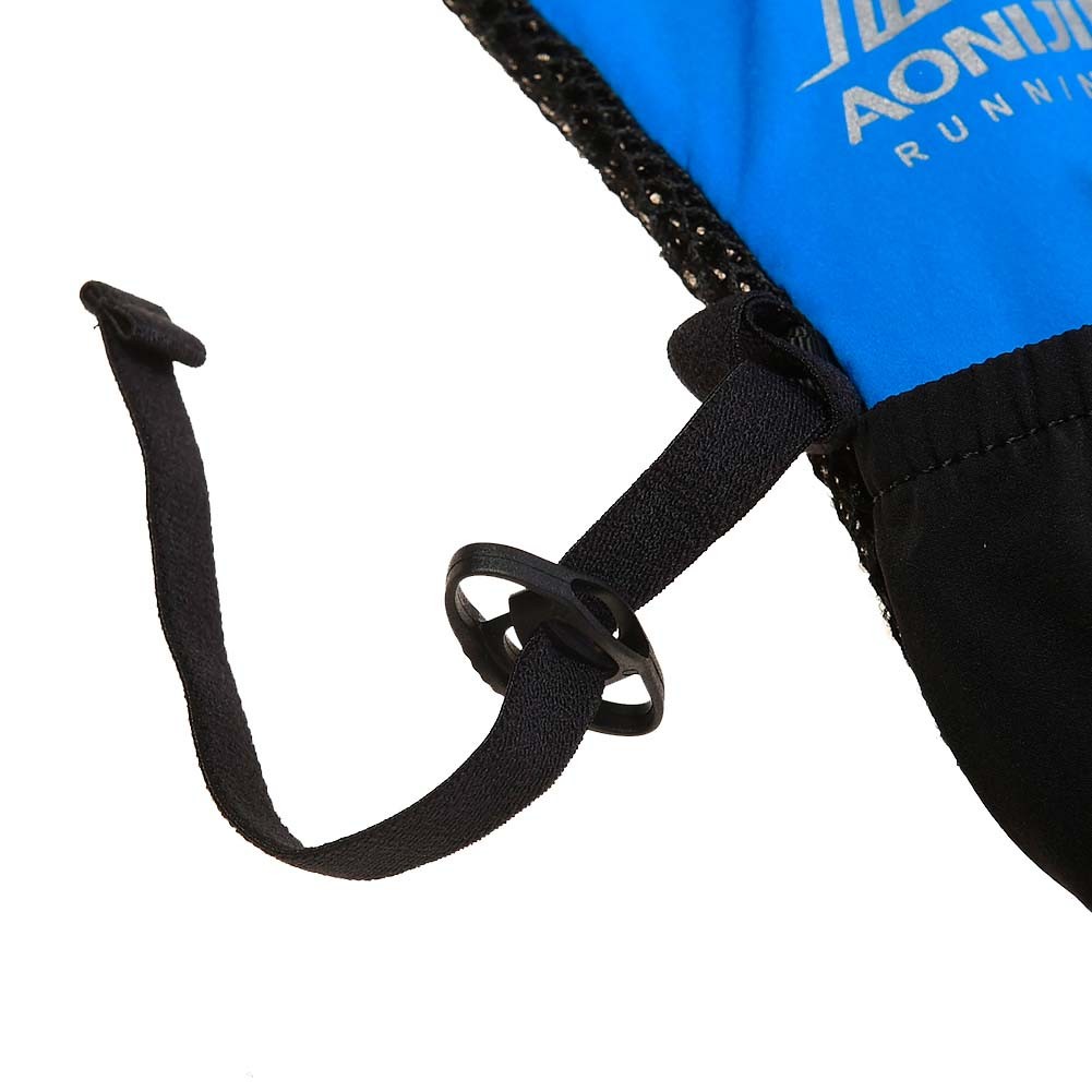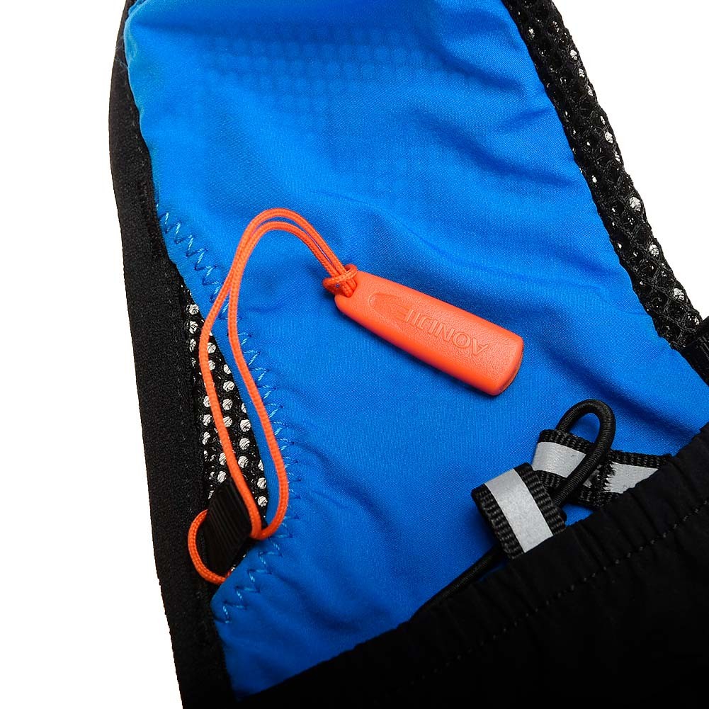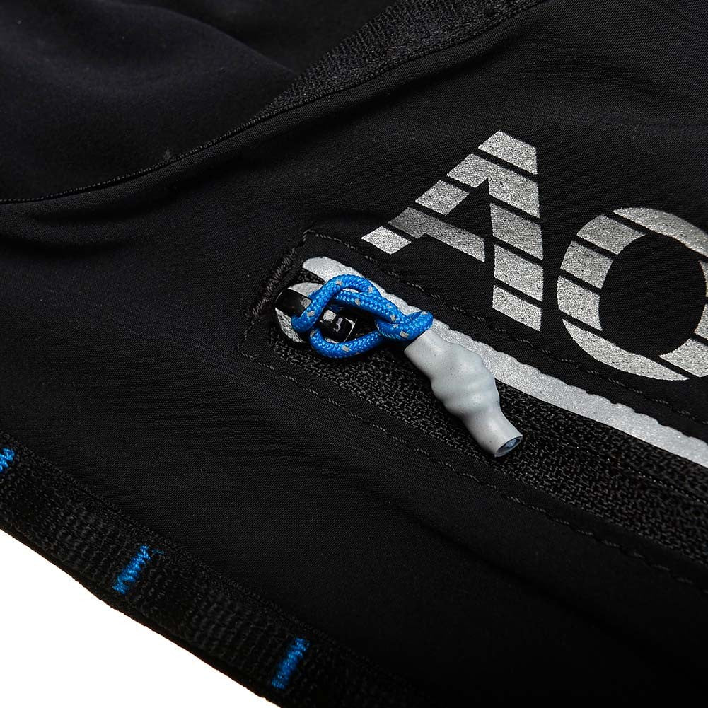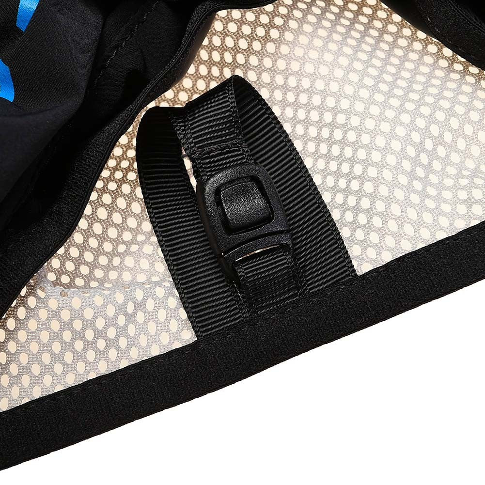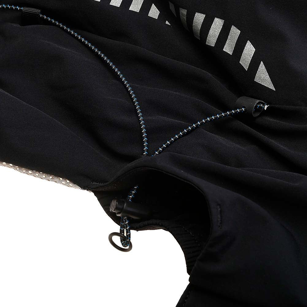 - Dos bolsillos delanteros de malla expandible con capacidad para dos soft flask de 500ml, y goma elastica con tirador reflectante para sujetar el soft flask doblemente, cierre bolsillo elástico y goma elástica