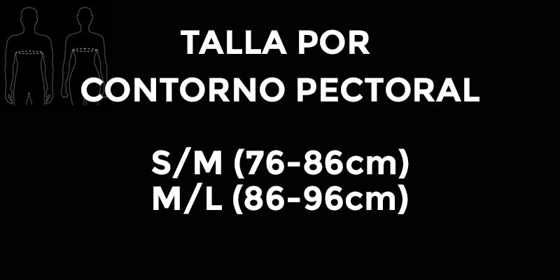 - Producto en varias tallas, medidas según contorno de pecho: S/M (76-86cm) ; M/L (86-96cm); L/XL (96-106cm). Se recomienda medir la máxima amplitud pectoral entre la línea mamaria y las axilas.